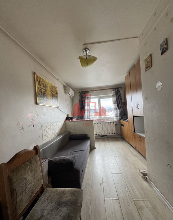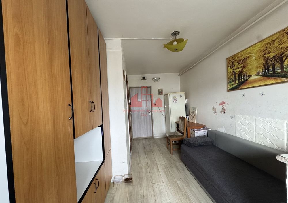 Garsoniera de vanzare in Cluj Napoca | Cartierul Intre Lacuri | Zona Fujikura. Garsoniera este situat la etajul 4, avand o suprafata utila de 15 mp dispune o camera cu bucatarie si o baie. Finisajele de tip clasic sunt evidentiate astfel: - pardoseala cu parchet laminat; - pereti cu lavabil; - baia este dotata cu gresie si faianta clasica; - usa de la intrare este metalica; Sistemul de incalzire in apartament este cu centrala de bloc, aer conditionat. Apartamentul se vinde ca in poze, blocul fiind dotat cu interfon. Pentru programarea unei vizionari nu ezitati sa ne contactati!