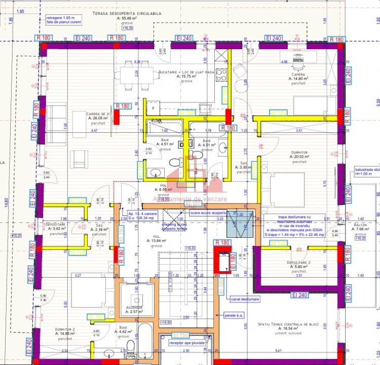 Apartamente Cluj vă propune spre vânzare un penthouse de 4 camere, semifinisat, situat într-un imobil nou, cu finalizare la sfârșitul anului 2026, amplasat în cartierul Iris, în imediata apropiere a Parcului Feroviarilor și a viitorului proiect RIVUS. Proiectul este poziționat într-o zonă în plină dezvoltare a municipiului Cluj-Napoca, cu acces facil către zone verzi, puncte de interes și viitoare centre comerciale și de business. Apartamentul este amplasat la etaj retras, ocupând întregul nivel, oferind un grad ridicat de intimitate. Are o suprafață utilă de 126 mp și este compartimentat eficient în: living cu bucătărie, 3 dormitoare, 3 băi, dressing, terasă de 55 mp, balcon de 8 mp. Locuința se predă la stadiul de semifinisat, cu: șapă, un strat de glet, ferestre termoizolante, ușă de intrare, încălzire în pardoseală, precum și toate instalațiile electrice și sanitare trase la poziție. Imobilul are un regim de înălțime redus și cuprinde doar 13 apartamente, toate decomandate, oferind un cadru exclusivist de locuire. Preț: 3.000 euro/mp + TVA Garaj subteran: 15.000 euro + TVA (CF individual) Pentru detalii suplimentare sau programarea unei vizionări, echipa Apartamente Cluj vă stă la dispoziție.